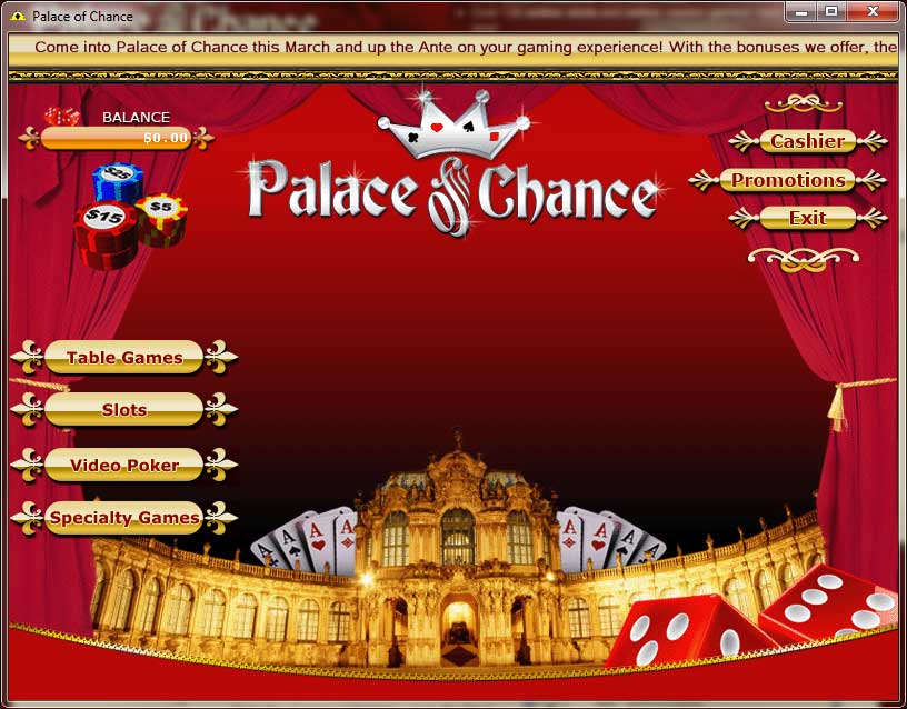 The following table outlines the current exclusive welcome bonuses for new players at Palace of Chance Casino: